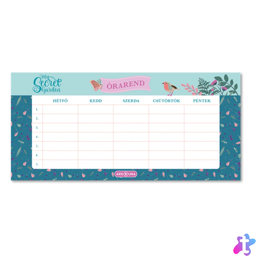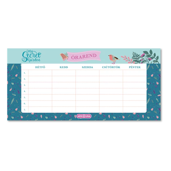 Kétoldalas, magyar nyelvű órarend A és B hét beosztással. 250 gr-os félfényes műnyomó papírra, 4 szín nyomással nyomott.