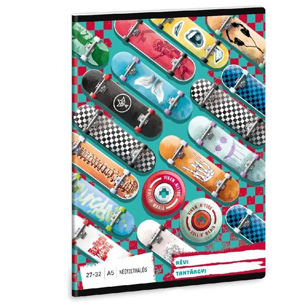 A/5-ös méretű négyzethálós füzet. 32 lapos, belseje 75 gr-os papírból. Borítója 250 gr-os műnyomó kartonra lekerekített sarkokkal, fényes fóliázással, 4 szín nyomással készült.