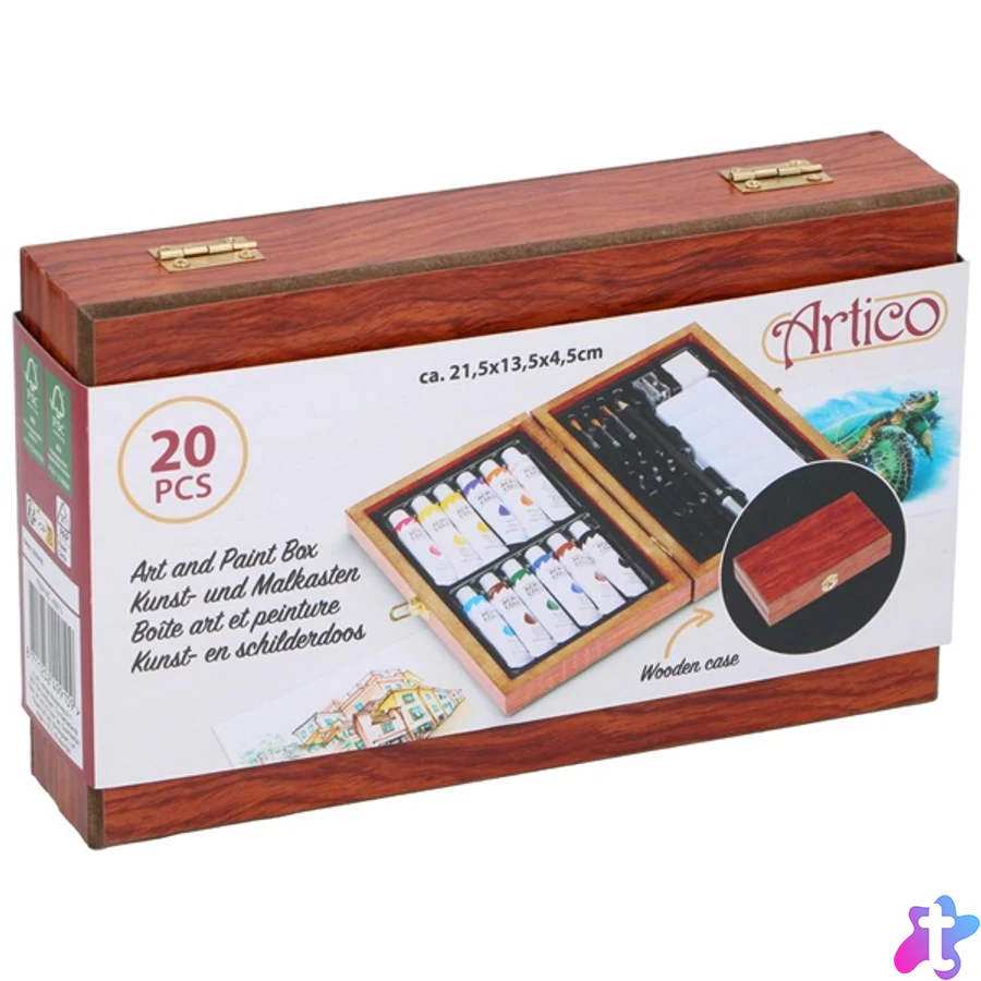Artico akril festőkészlet. A gyönyörű és praktikus fadoboz mindent tartalmaz, ami a festés megkezdéséhez szükséges, beleértve az ecseteket, 12 élénk színű festéket, egy praktikus palettát, egy HB ceruzát a vázlatkészítéshez és egy ceruzahegyezőt.