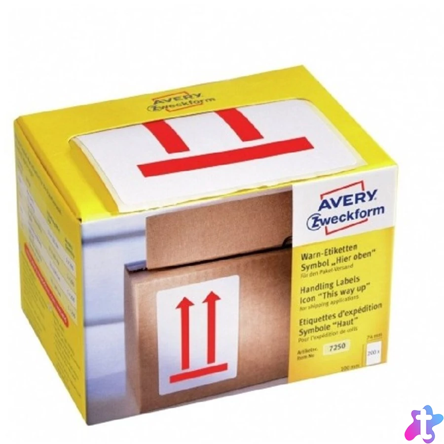 "Az Avery Zweckform 7250 cikkszámú, elnyomott figyelemfelhívó csomagkezelő címkéi ""A nyíllal megegyező irányba állítandó!"" (dupla felfelé mutató nyíl) utasítást jelentő jellel, 74x100 mm méretben nemzetközileg is ismertek és elfogadottak. Belföldi és nemzetközi csomagok felcímkézésére egyaránt alkalmas. 200 csomagkezelő címke tekercsenként, praktikus és védelmet jelentő karton adagolóban. A intenzív színnek és a nemzetközileg ismert jelnek köszönhetően azonnali felismerést biztosít. A speciálisan kifejlesztett ragasztónak köszönhetően megbízhatóan tapad minden általános csomagolóanyagon pl. borítékon, dobozon, fólián, stb. A címkék közötti perforációnak köszönhetően a feldolgozás gyors és egyszerű, különösen hatékony megoldást jelent nagyobb csomagolóállomásokon. A kartonadagoló nagyobb rugalmasságot és kényelmet kínál. Avery Zweckform csomagkezelő címkék: megbízható, bizonyított márka és minőség!"