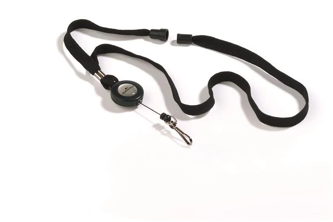 Biztonsági kioldóval ellátott nyakba akasztható textil szalag, kihúzható tartóval.