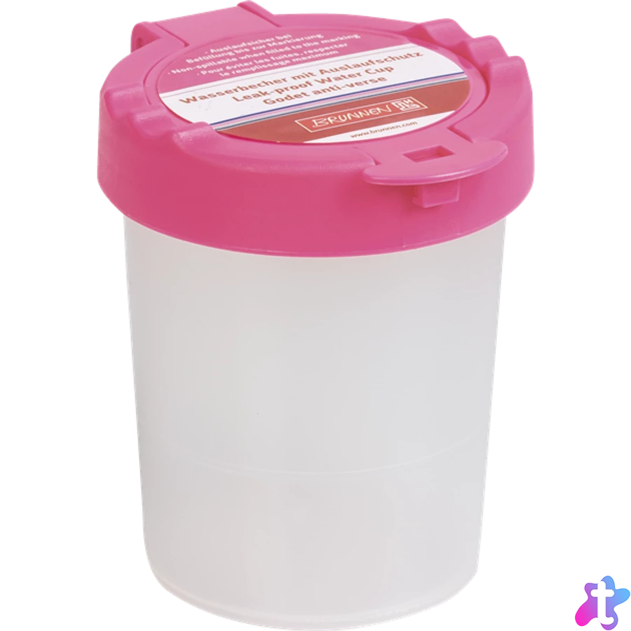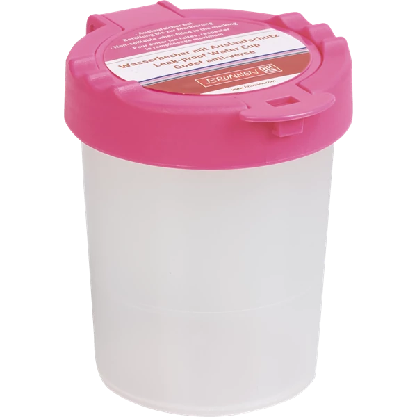 Ecsettál zárható fedővel tulipán színben. Két ecset tárolási lehetősége a tetején. A praktikus fedél megakadályozza a víz szivárgását.