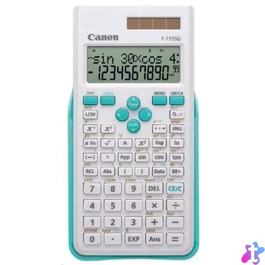 Az extra nagy kétsoros kijelző könnyen leolvasható A tanuláshoz, vizsgaíráshoz és házifeladat-készítéshez is ideális megoldást nyújtó F-715SG tudományos számológép extra nagy kétsoros LCD kijelzővel rendelkezik. A bevitt adatok a felső sorban, az eredmények pedig az alsó sorban jelennek meg - a kijelző akár 10 számjegyes eredményt és 2 számjegyes exponenciálist is képes megjeleníteni. A fő karakterek mérete a kijelzőn 9,6 × 3,96 mm, így egy szempillantás alatt, könnyen leolvashatók az eredmények.250 különböző funkció Ez a minden szempontból intelligens tudományos számológép - amely nemcsak az általános matematikai műveleteket képes elvégezni, hanem trigonometriai, statisztikai, fizikai és mérnöki számításokra is alkalmas - minden olyan funkcióval rendelkezik amelyre a diákoknak a matematikai tanulmányok és a számításokat igénylő tudományos tárgyak elsajátítása közben szükségük lehet. A fejlett problémamegoldást lehetővé tevő F-715SG összesen 250 funkcióval rendelkezik. Memóriájában akár 17 számítás és tárolható és előhívható, lehetővé téve a felhasználó számára a különböző minták és elképzelések feltérképezését. Továbbá a belső számításokat 16 számjeggyel képes elvégezni, ami pontosabb eredményekhez vezet.Részben újrahasznosított Canon anyagokból készült Az F-715SG praktikus és az eddigi legkörnyezetbarátabb választás. Ennek oka, hogy a Canon hulladék műanyagot használ a hátlap és a fedél előállításához. A leselejtezett termékeket erőforrásként kezelve újraindul azok hasznos élettartama.Megbízható kettős áramellátás Ez a tudományos számológép napelemmel és normál elemmel egyaránt működik, ami folyamatosan biztosítja a megbízható teljesítményt, és kettős biztonságot jelent vizsgaírás közben. Amennyiben a fényviszonyok megengedik, használja az energiatakarékos napelemes megoldást, szükség esetén pedig térjen át a tartalék elem használatára. Az F-715SG arra is többször, időben figyelmeztet, ha az elem kezd lemerülni. Amennyiben a számológépet 7 percig nem használják, az „automatikus kikapcsolás” funkció kikapcsolja a készüléket, meghosszabbítva az elem élettartamát.Három elegáns színváltozatA praktikus és stílusos F-715SG kapható feketében, illetve fehérben magenta vagy kék színű nyílgombbal és fedéllel. Súlya mindössze 124 gram, ezért könnyen szállítható. A kemény elcsúsztatható fedél megvédi a billentyűzetet és a kijelzőt a mindennapos koccanásoktól és ütésektől.