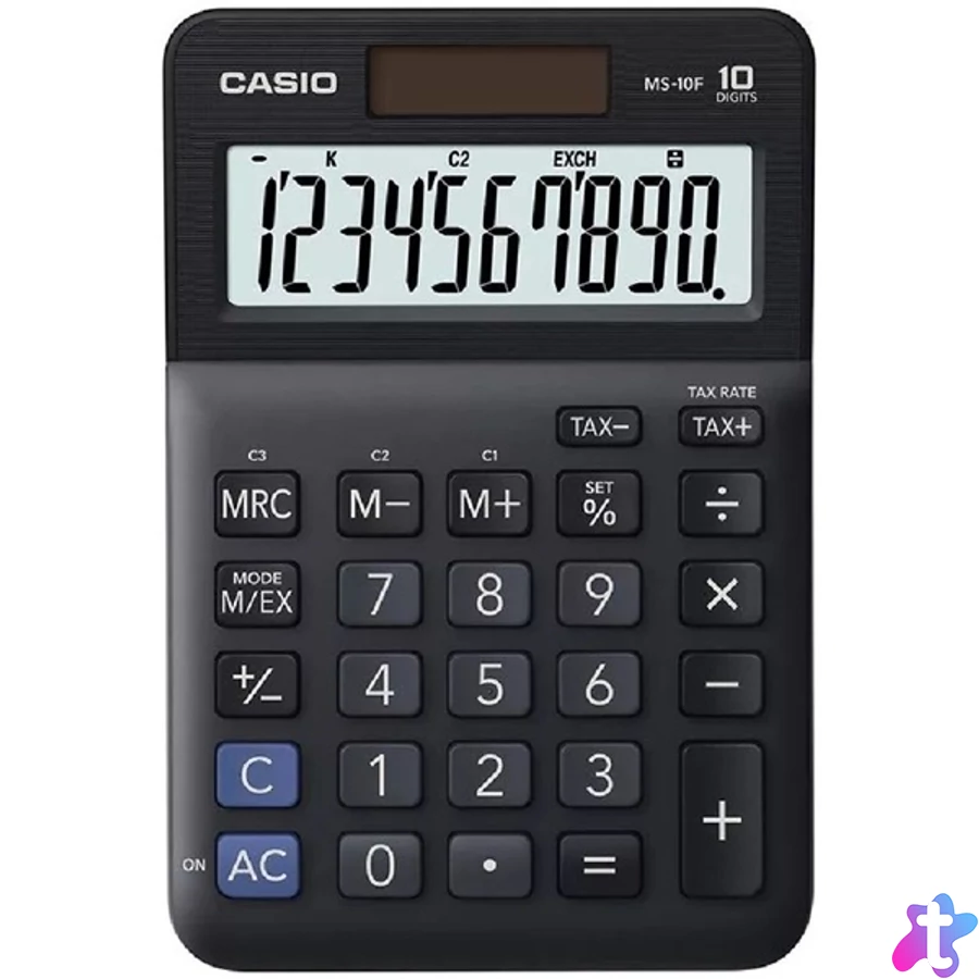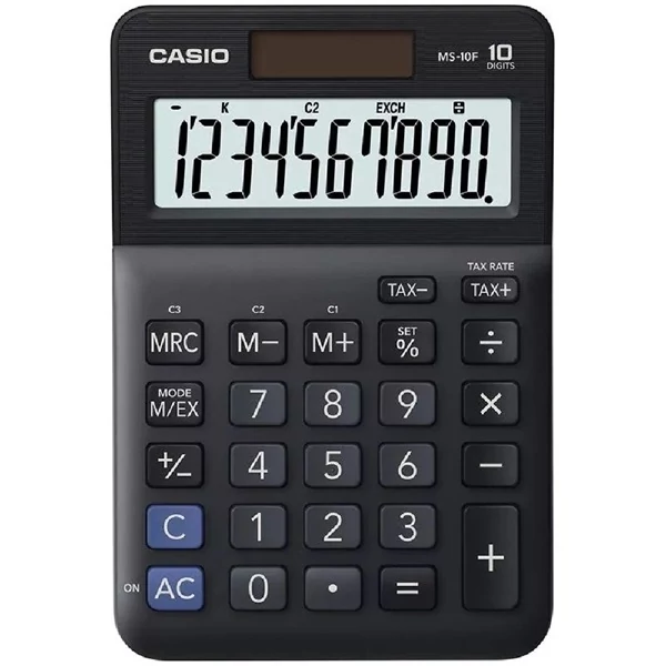 10 számjegyű, NAGY DÖNTÖTT KIJELZŐ, ÁFA számítás, valutaátváltás, elem+napelem, %, +/-