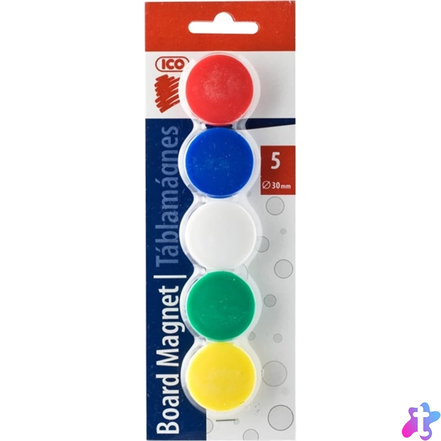 Acél táblafelületeken rögzíthető mágnes korongok. 30mm, 5 db/csomag, 5 féle szín.