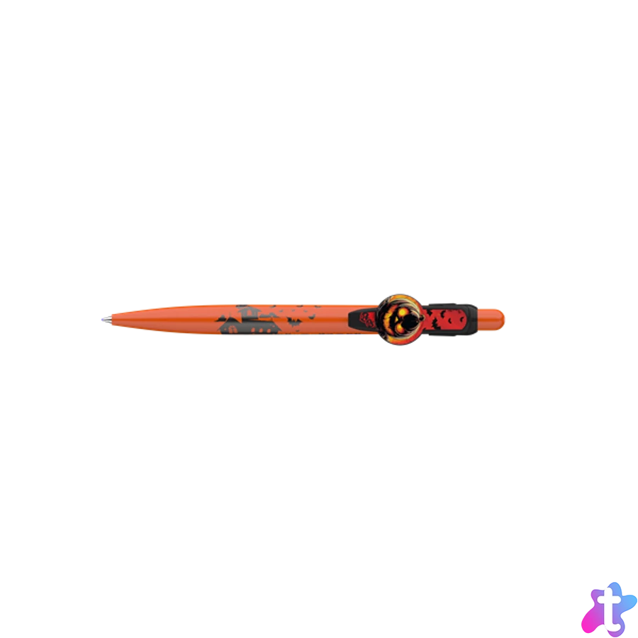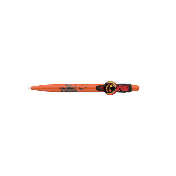 Halloween motívumokkal díszített nyomógombos mechanikával működő golyóstoll. Cserélhető X-20-as betéttel. Golyóátmérő 0,8 mm. Íráshossz 2500 m.