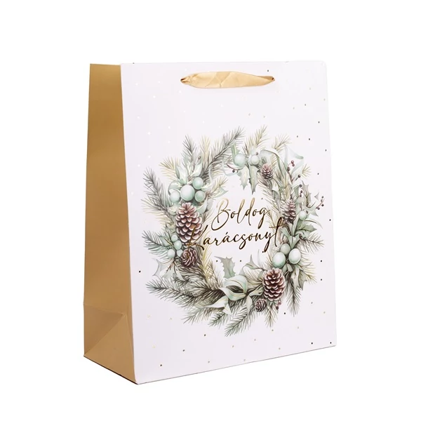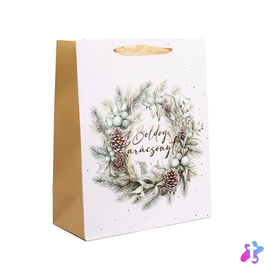 BOLDOG KARÁCSONYT KOSZORÚ PAPÍRTASAK MATT FEHÉR/ARANY 26*32 CM