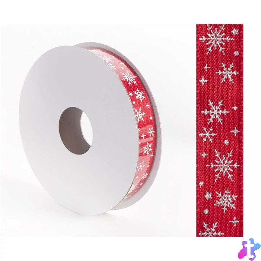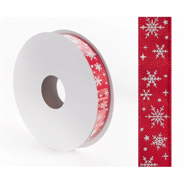 Piros színű dekor csomagkötöző szalag, hópihés díszítéssel, karácsonyi ajándékokhoz