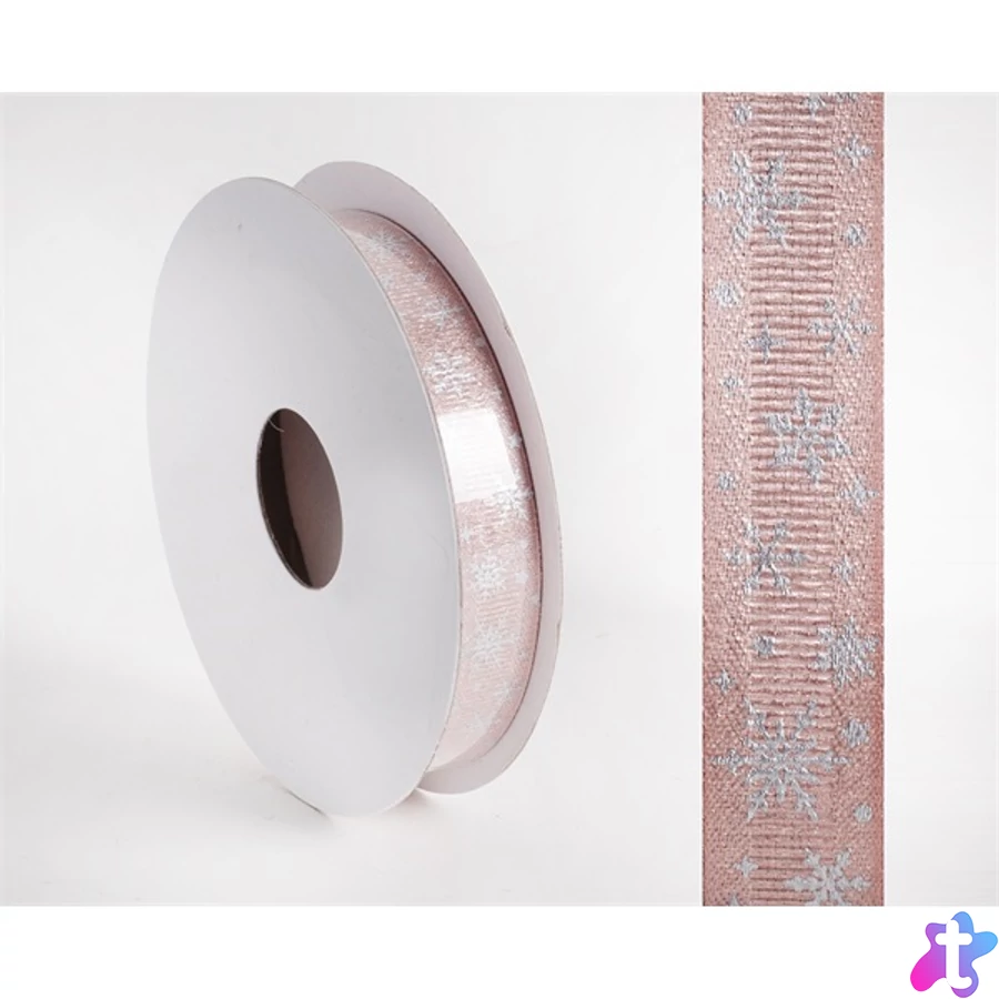 Rózsaarany színű dekor csomagkötöző szalag, hópihés díszítéssel, karácsonyi ajándékokhoz
