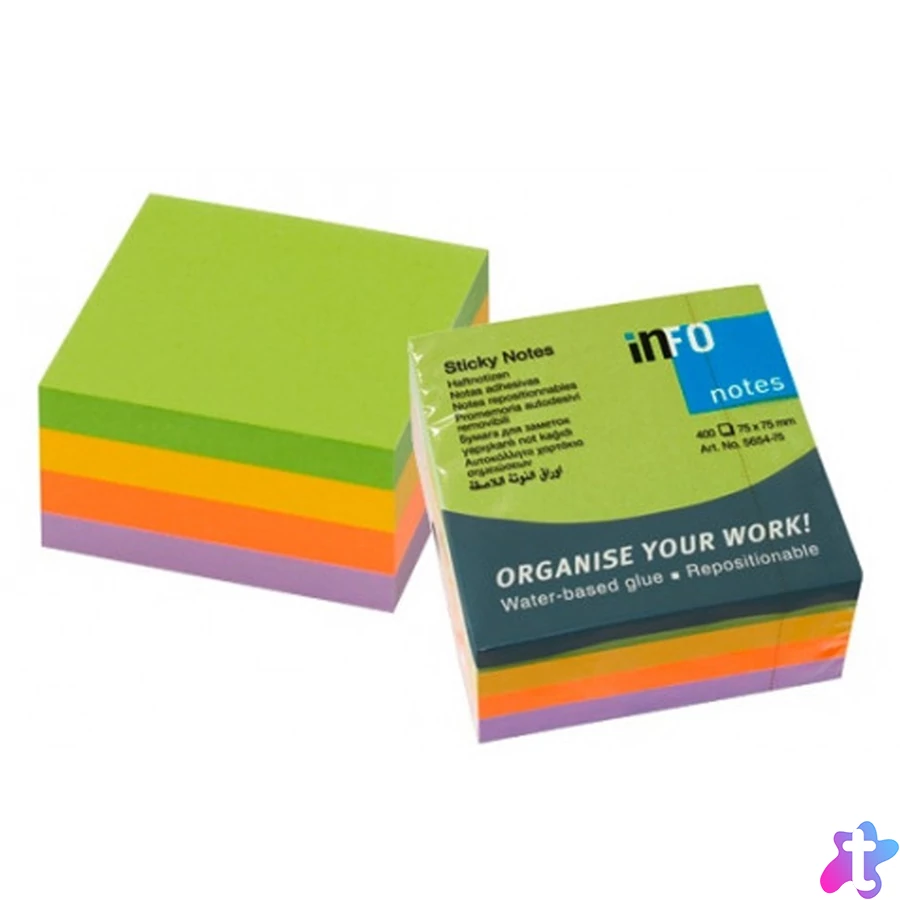 Jegyzettömb öntapadó, 75x75mm, 100lap, Info Notes, brilliant mix, sárga, zöld, pink, narancs
