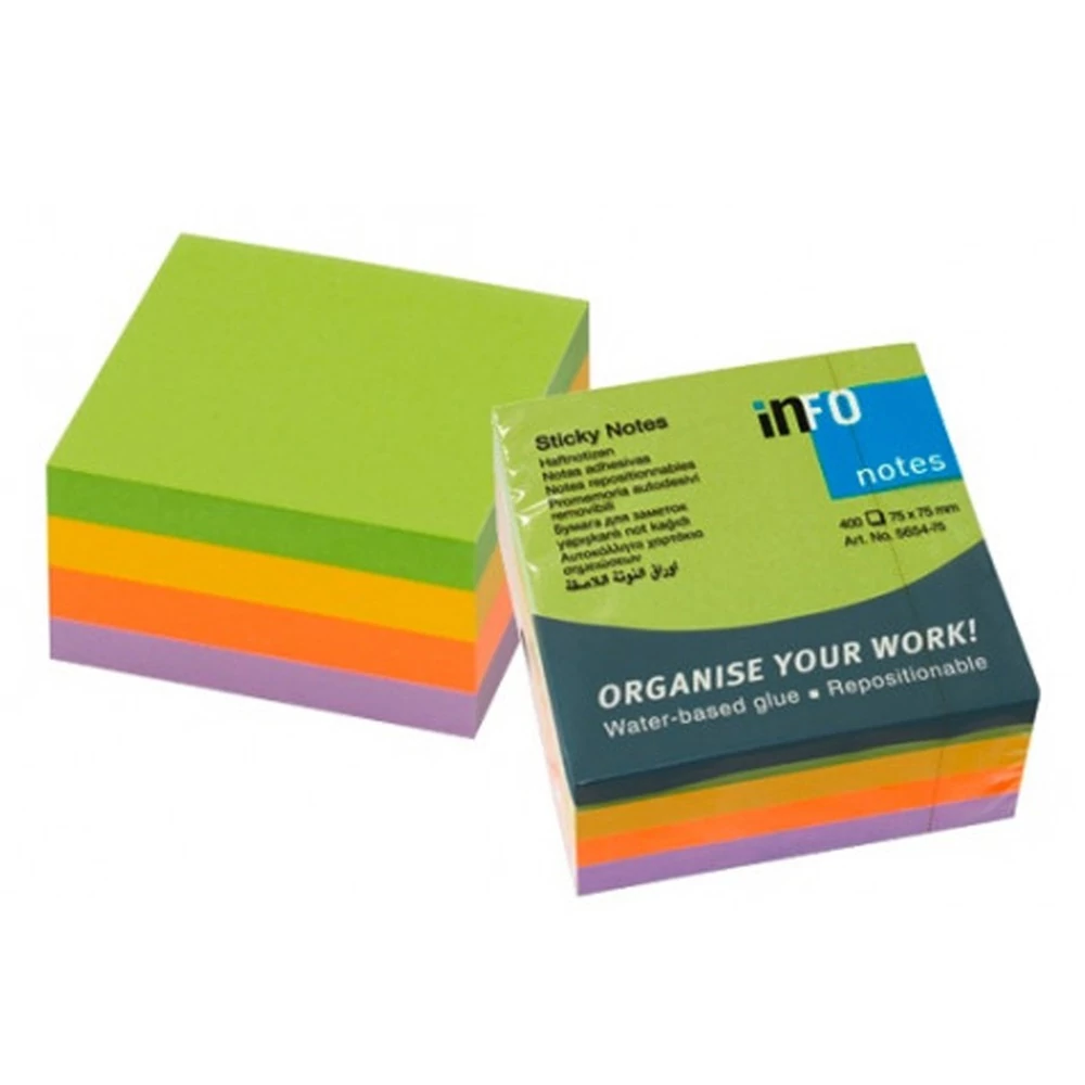 Jegyzettömb öntapadó, 75x75mm, 450lap, Info Notes intenzív zöld, sárga, lila, narancs