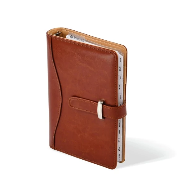 Fényes, bőrhatású műbőrből készült, bedugófüllel záródó, fehér lapos kalendárium. A gyűrűs kalendárium tartalma: éves kalendárium (éves tervező leporelló, heti tervező), négyzethálós jegyzetlapok, telefonregiszter, névjegytartó, elválasztólap, vonalzó, műanyag protektor (elválasztó). Egyediesítés: szitázás, présfólia- és vaknyomás, névnyomás, monogram. Tokméret: 180x240 mm, lapméret: 146x210 mm