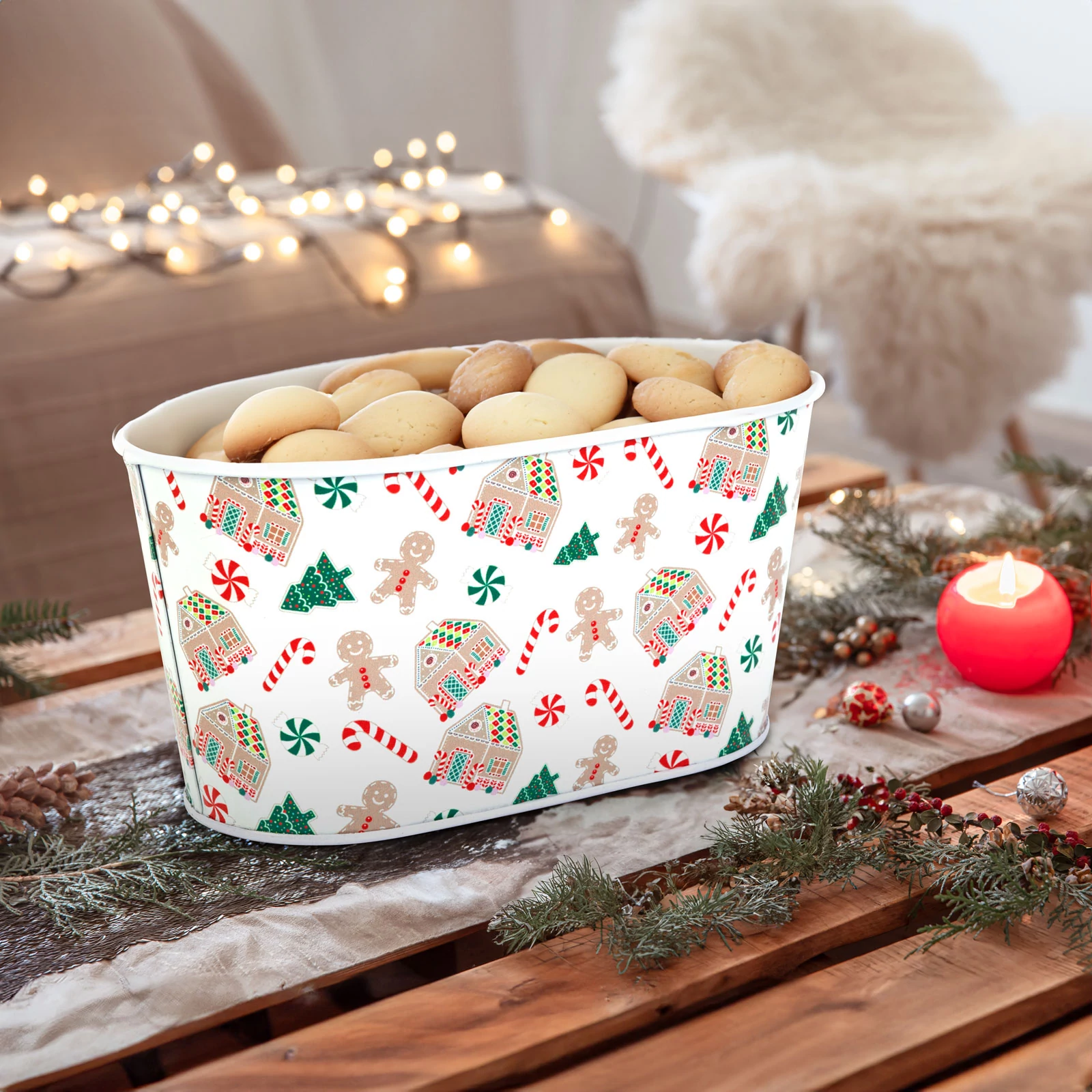 Ez a vidám, mézeskalács házikó mintás karácsonyi fém kosár tökéletes választás az ünnepi időszakra! Használhatja sütemények, apró ajándékok, édességek vagy akár dekorációk tárolására is. A tartós, fém anyag strapabíróvá teszi, a színes mintázat pedig, ünnepi hangulatot teremt. Elhelyezhető asztalon, polcon vagy komódon – bárhol jól mutat!