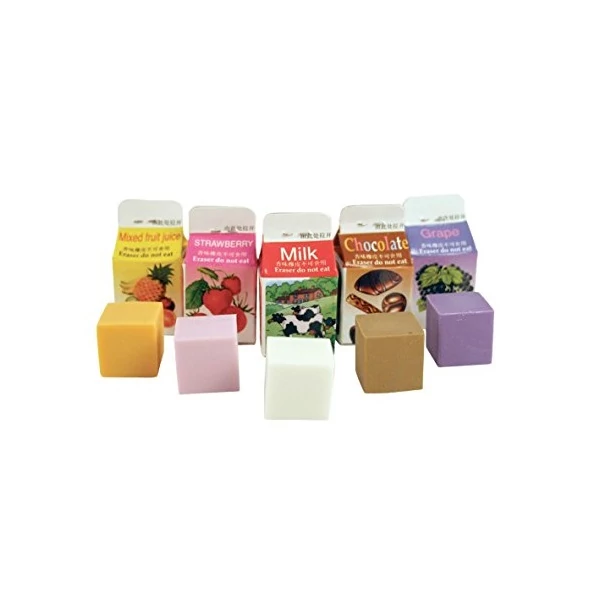 A tejesdoboz csomagolás 5 db enyhén illatosított radírt rejt: gyümölcslé, eper, szőlő, csoki és tejes illatúakat. Ne edd meg!