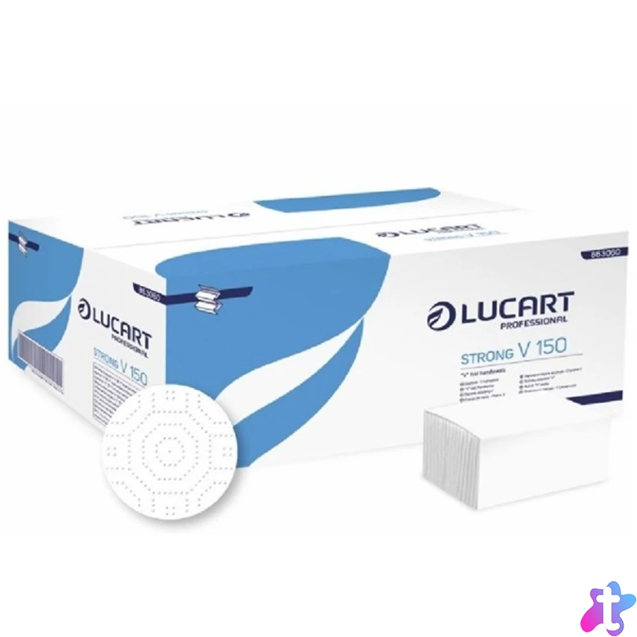 Lucart Strong kéztörlő, V hajtogatott, 2 rétegű, prégelt és ragasztott, fehér 150 lap/csomag, mérete: 23 x 21 cm, PEFC