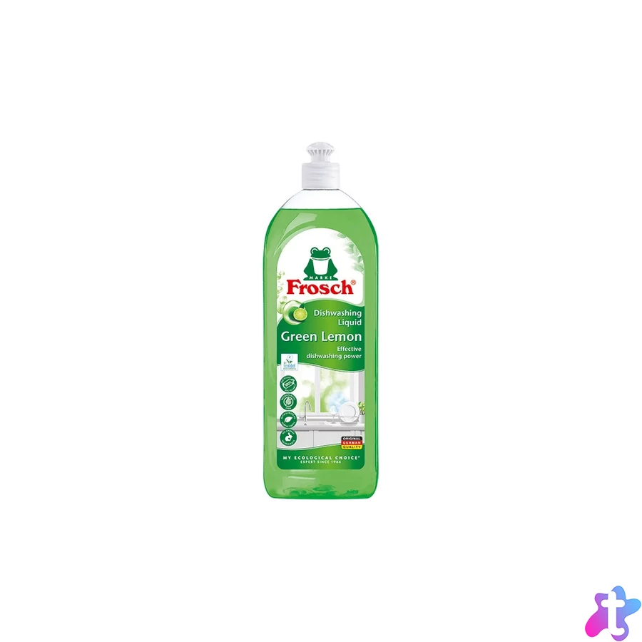 Mosogatószer balzsam 750 ml Frosch Zöld Citrom hatékonyan tisztítja meg az edényeket a szennyeződésektől. Citromkivonattal és növényi alapú felületaktív anyagokkal készült, eltávolítja a zsírt és a szennyeződéseket, és kíméletes a bőrhöz. pH-semleges, bőrgyógyászatilag tesztelt.