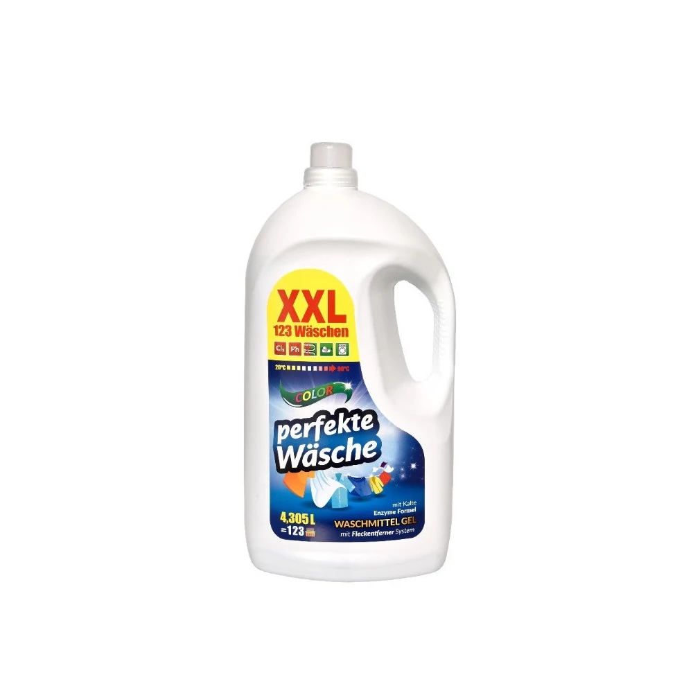 Perfekte Wasche COLOR folyékony mosószer színes ruhák mosásához (123 mosás). Rendkívül hatékony mosószer színes ruhanemű kézi és gépi mosásához, makulátlanul friss és illatos ruhaneműt garantál az egész családnak, még alacsony hőmérsékleten vagy kézi mosáskor is. Nem tartalmaz foszfátokat. Alkalmas minden típusú mosógéphez, bármilyen vízkeménység mellett.