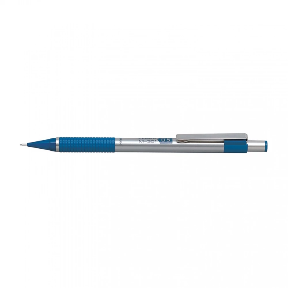 Az M-301 mechanikus ceruza az F-301 golyóstoll párja, rendkívüli népszerűségnek örvend, amit a rendhagyó forma, a rozsdamentes acél tolltest, a bordázott markolat és mindezek együttes hatása meg is magyaráz. A fém nyomógomb alatt beépített radír található. Markolat színe kék . Hegyvastagság: 0,5mm. 10db/gyűjtő, 1000db/karton. Mechanikus ceruza, pixirón. Katalóguskód: 811