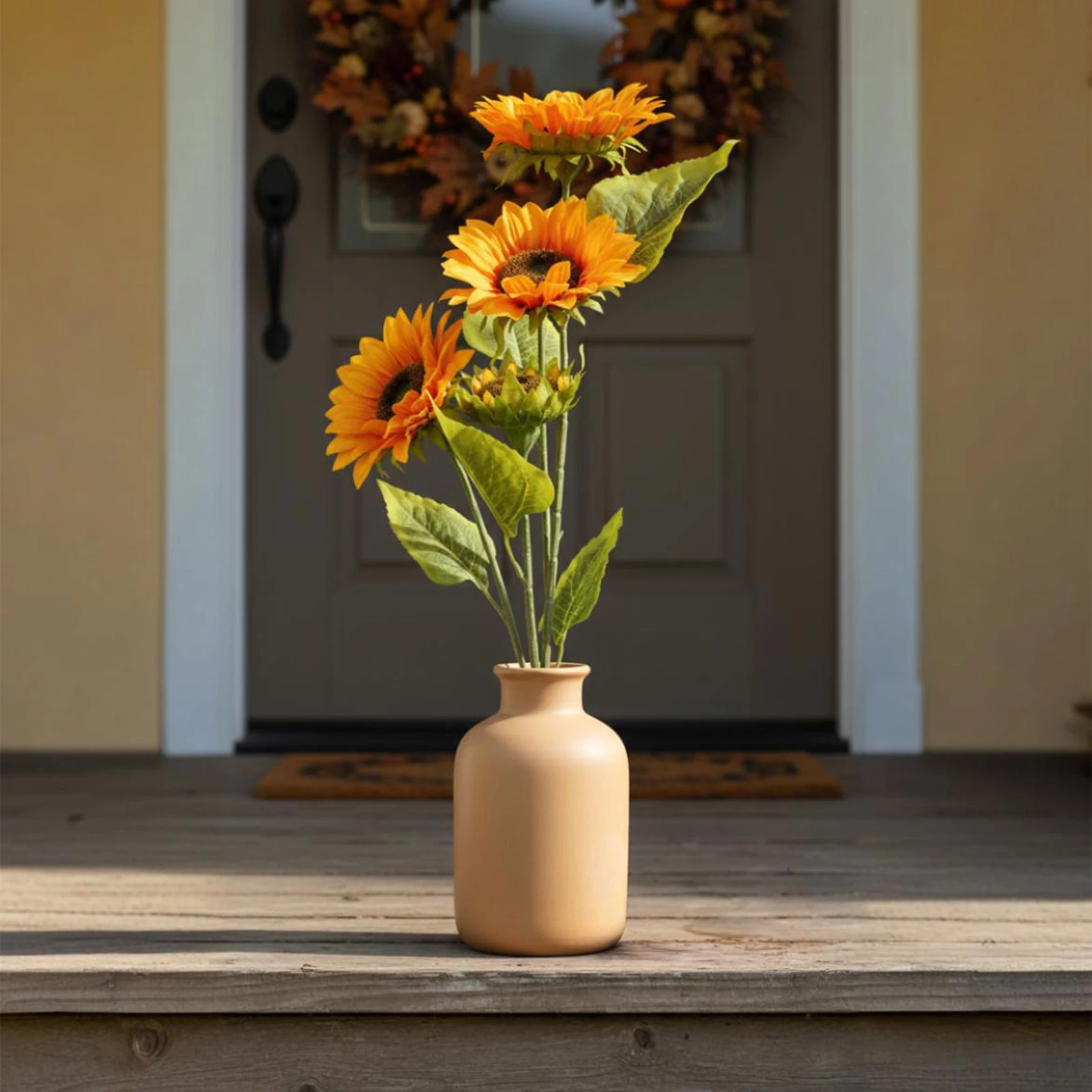 Varázsolja otthonába az ősz meleg és barátságos hangulatát ezzel az elegáns, élethű napraforgó dekorációval! A 90 cm magas szár három gyönyörű, citromsárga virágfejet tart, amelyek részletgazdag kidolgozásuknak köszönhetően természetes hatást keltenek.