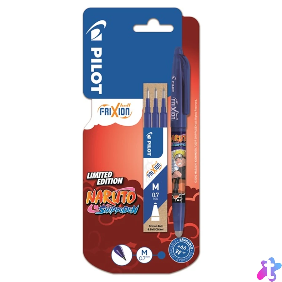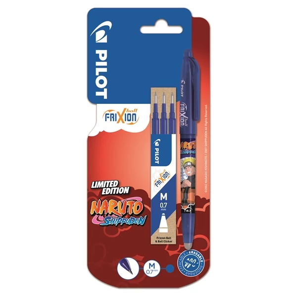FriXion 07 betétszett kék 3 db-os + NARUTO Limited Edition FriXion Ball rollerirón, ami különleges hőérzékeny tintával töltött roller, mely a toll végén található gumival kiradírozható. Írásvastagság: 0,35 mm. A tollat a NARUTO anime sorozat karakterei díszítik.