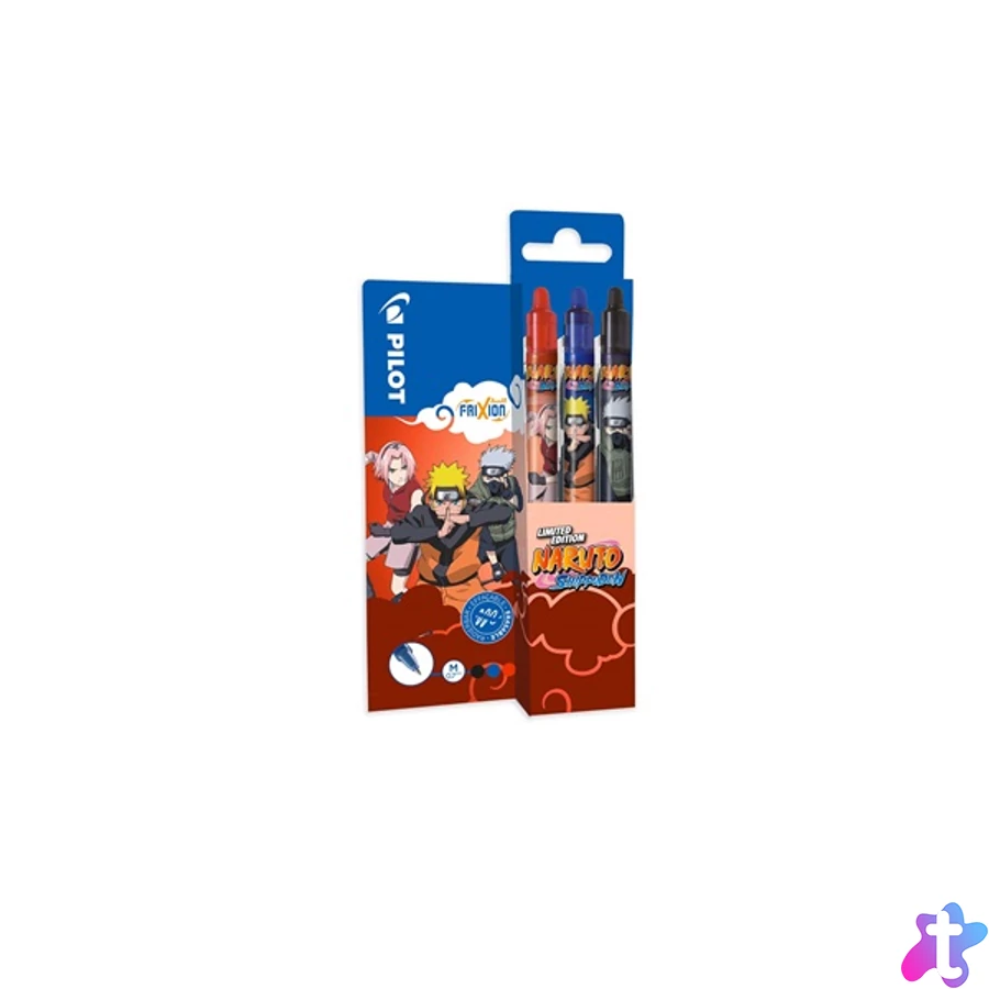 FriXion Clicker NARUTO Limited Edition fekete, kék, piros rollerirón készlet. Különleges hőérzékeny tintával töltött roller, mely a toll végén található gumival kiradírozható. Írásvastagság: 0,35 mm. A tollat a NARUTO anime sorozat karakterei díszítik.