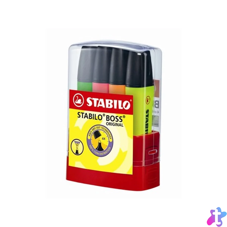 A STABILO BOSS ORIGINAL egy ikonikus, egyedi kialakítású, fluoreszkáló színekben kapható szövegkiemelő. A STABILO kiszáradás elleni technológiájának köszönhetően akár 4 órán keresztül használható kupak nélkül. Parktikus asztali tartóban.