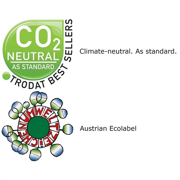 Nem hagy ökológiai lábnyomot. A gyártás során 100%-ban megújuló enegiaforrásokat használnak fel. A termékek méretének csökkentésével a gyártás és szállítás folyamán kevesebb energiaforrás szükséges. A megjelölt termékek 65%-ban újrahasznosítható anyagból készültek, illetve a felhasználást követően is újrahasznosíthatóak. A gyártási folyamat során szükségszerúen keletkezett CO2 kibocsátást, a Trodat a WWF által javasolt - Gold Standars Climate Protection Project - klímavédelmi projektbe történő befektetéssel egyenlíti ki.
