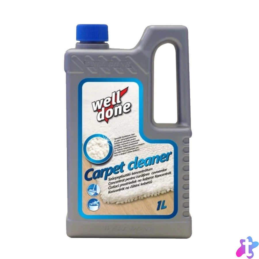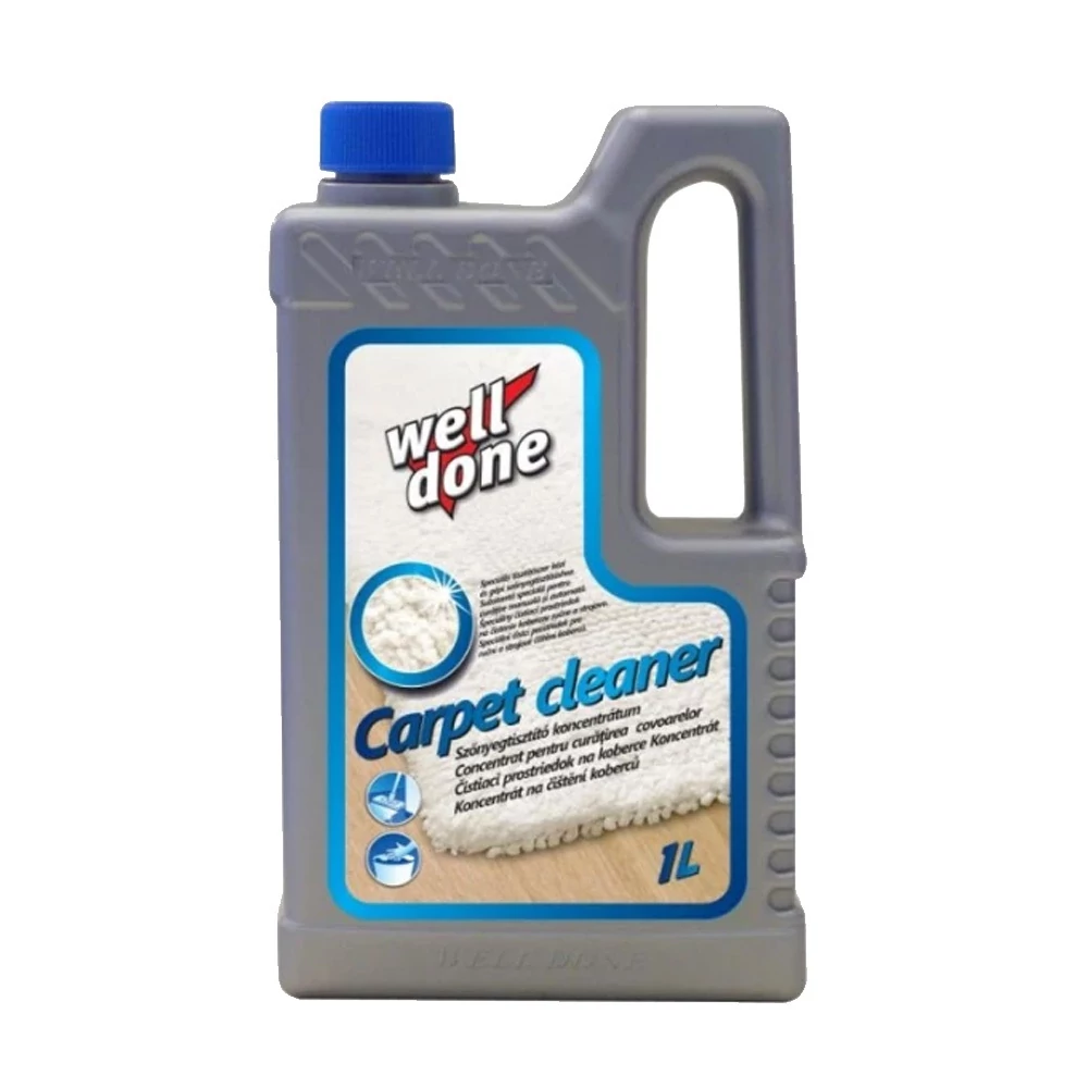 Well Done szőnyegtisztító speciális tisztítószer kézi és gépi tisztításhoz. Kiválóan alkalmas szőnyegek, kárpitok, valamint gyapjú és műszálas szőnyegek tisztítására, folttisztítására.