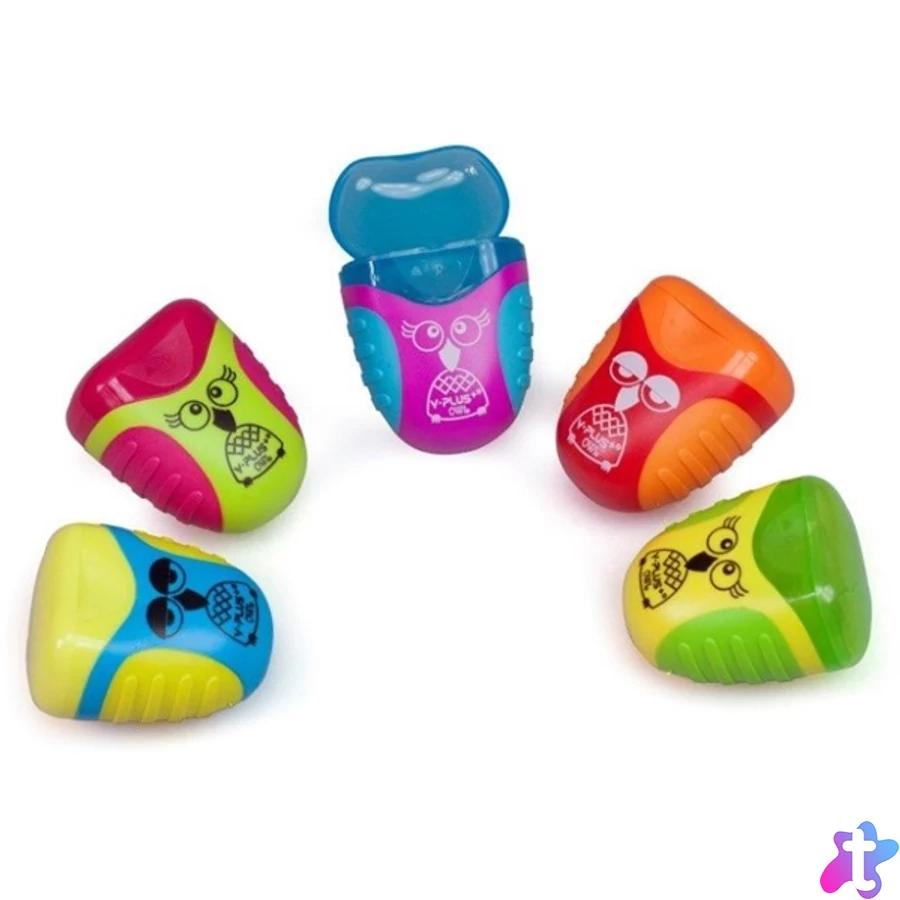 Műanyag, tartályos hegyező, 2 lyukú, 8 és 11 mm-es átmérőjű ceruzák hegyezésére. Vegyes színekben.